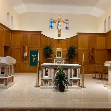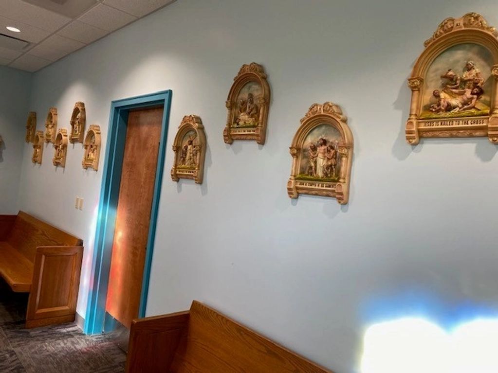 The Stations of the Cross were originally erected in the small St. Mary's Church on Pine Street in 1945. When the new church was built in 1948 and dedicated to Our Lady of Lourdes, they were installed there. They were replaced by the present Stations in 1953 and stored away. After 67 years in storage, they were restored and erected in our chapel in 2020.