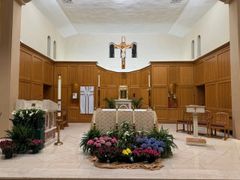 The Stations of the Cross were originally erected in the small St. Mary's Church on Pine Street in 1945. When the new church was built in 1948 and dedicated to Our Lady of Lourdes, they were installed there. They were replaced by the present Stations in 1953 and stored away. After 67 years in storage, they were restored and erected in our chapel in 2020.